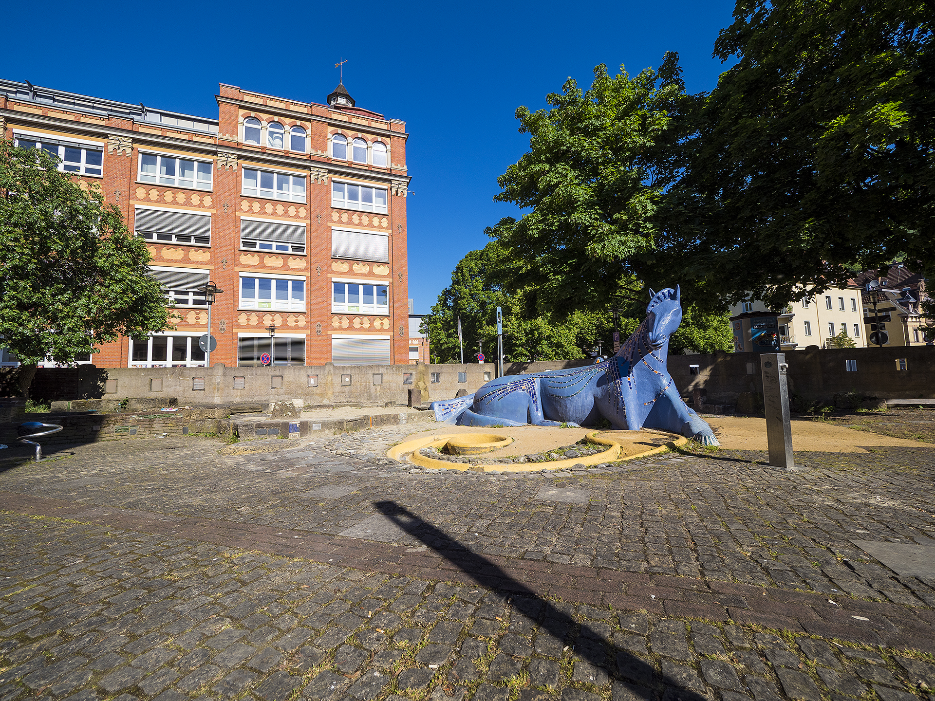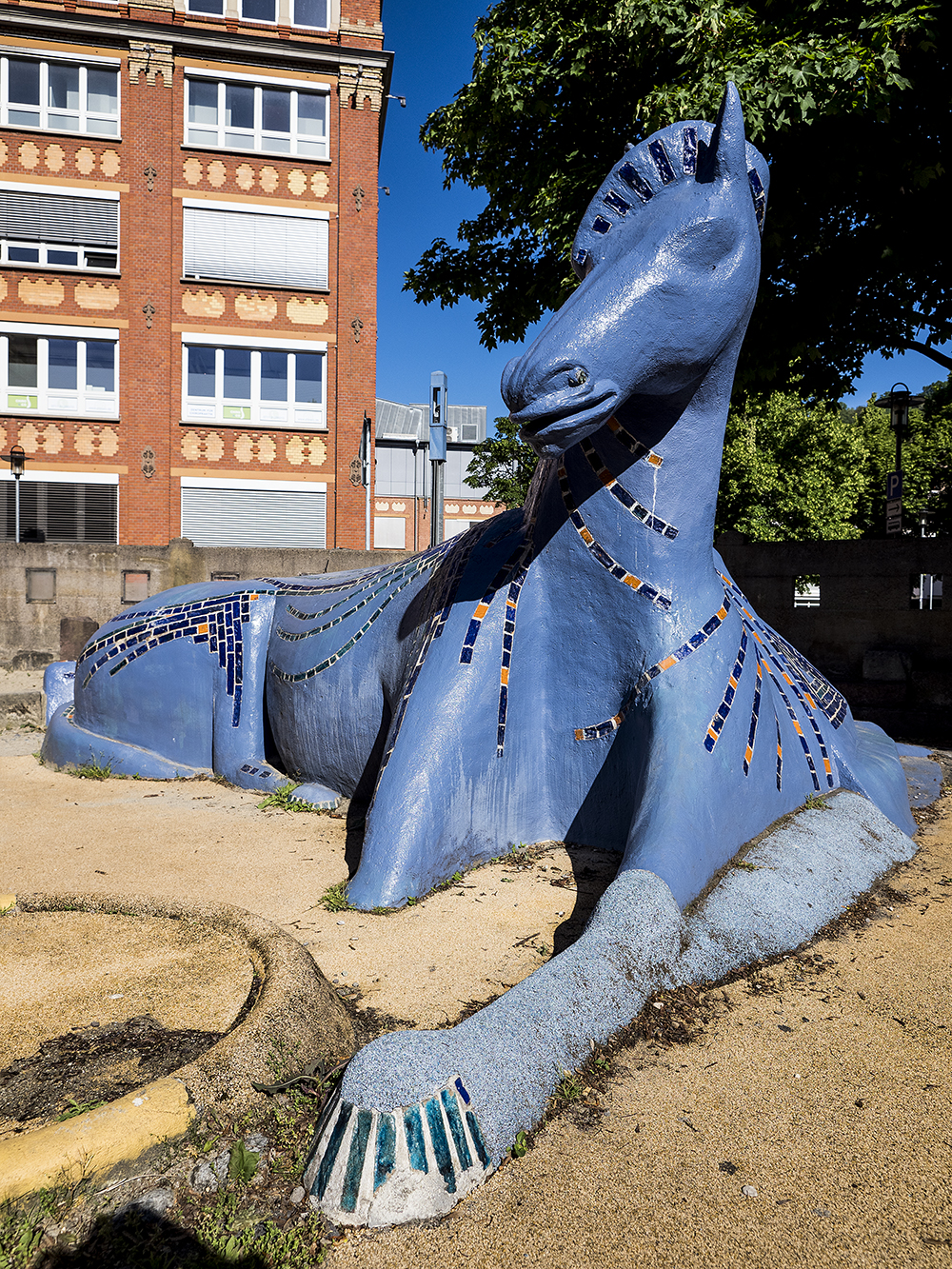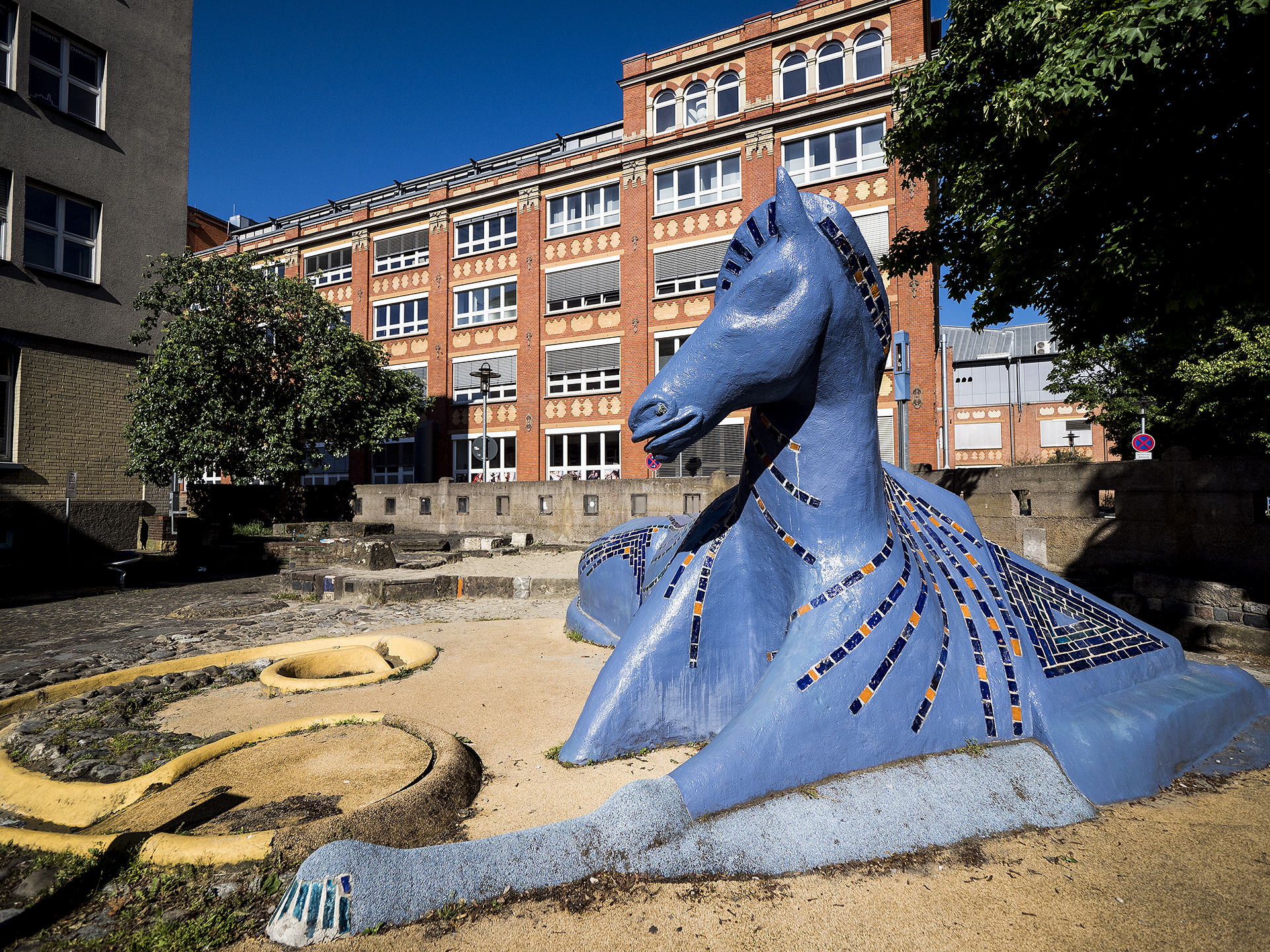 In Zusammenarbeit mit dem Grünflächenamt wurde ein Konzept erarbeitet um den Platz wieder zu beleben. Die Idee des blauen Pferdes war geboren, inspiriert von Franz Marc “der Blaue Reiter“. Spuren aus der Weststadt, alte Zahnräder, Klinkermauern. In die Einfassungsmauer um das Gelände wurden kleine Fenster ausgesägt. Für die Kinder besteht auch die Möglichkeit im Sommer mit Wasser zu spielen. Aus den Nüstern des Pferdes kommt Wassernebel, aus dem Pferdemaul ein Strahl bei Knopfdruck. Das Wasser mäandert in einer Spirale zurück. Die farbigen Mosaiken wurden in Handarbeit hergestellt.