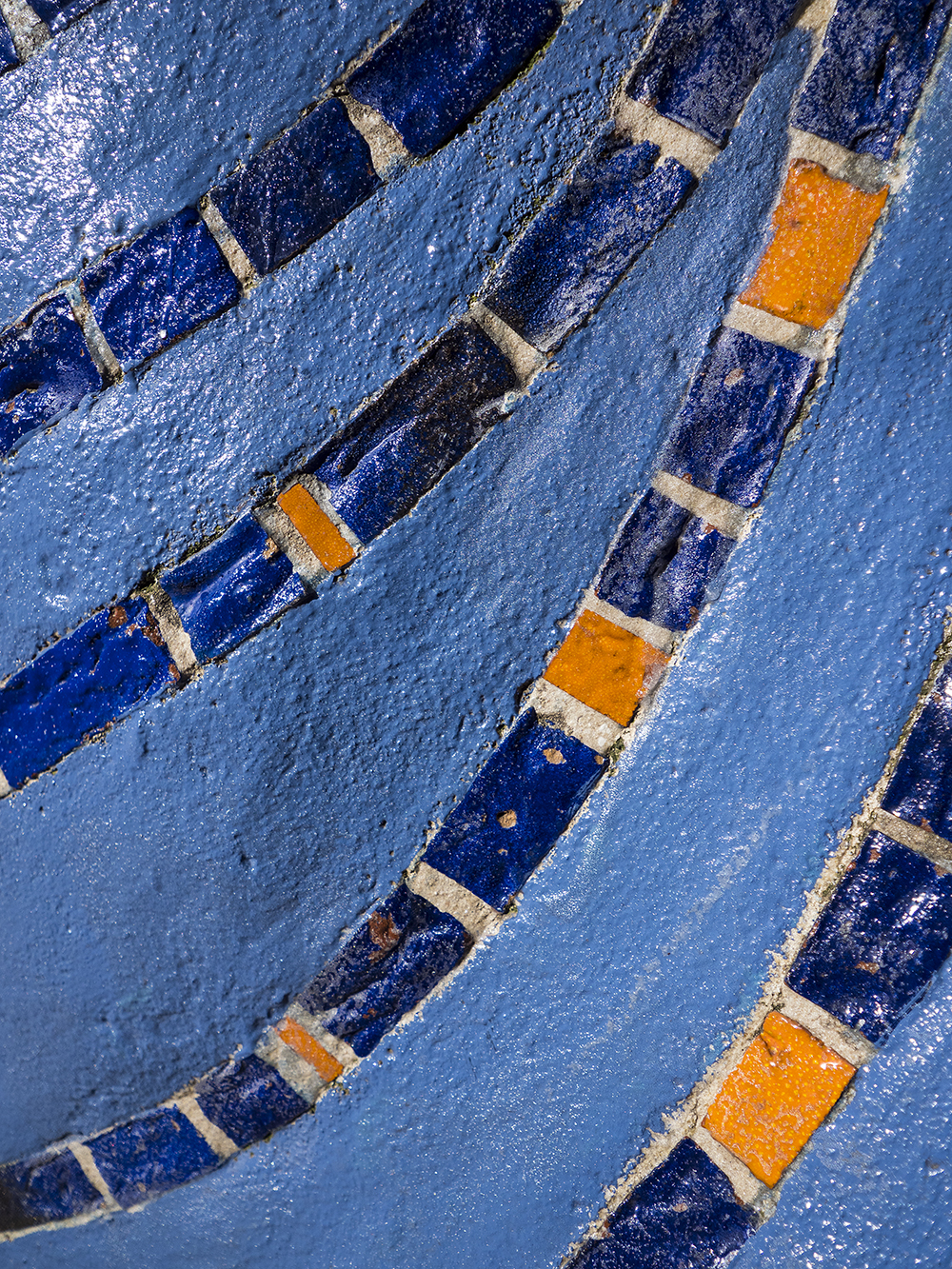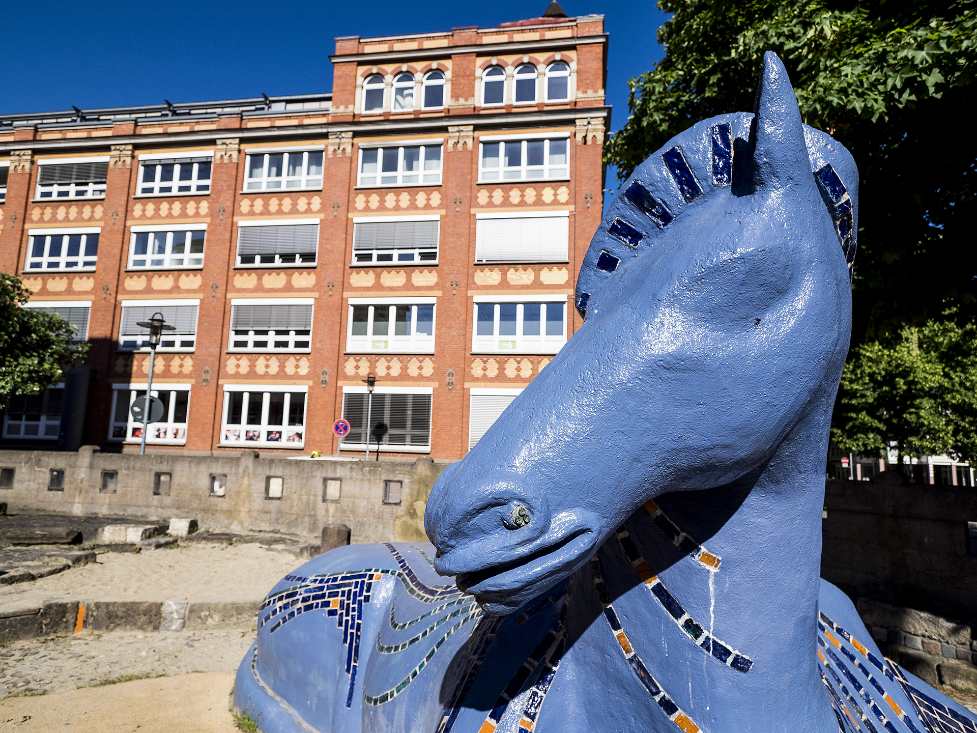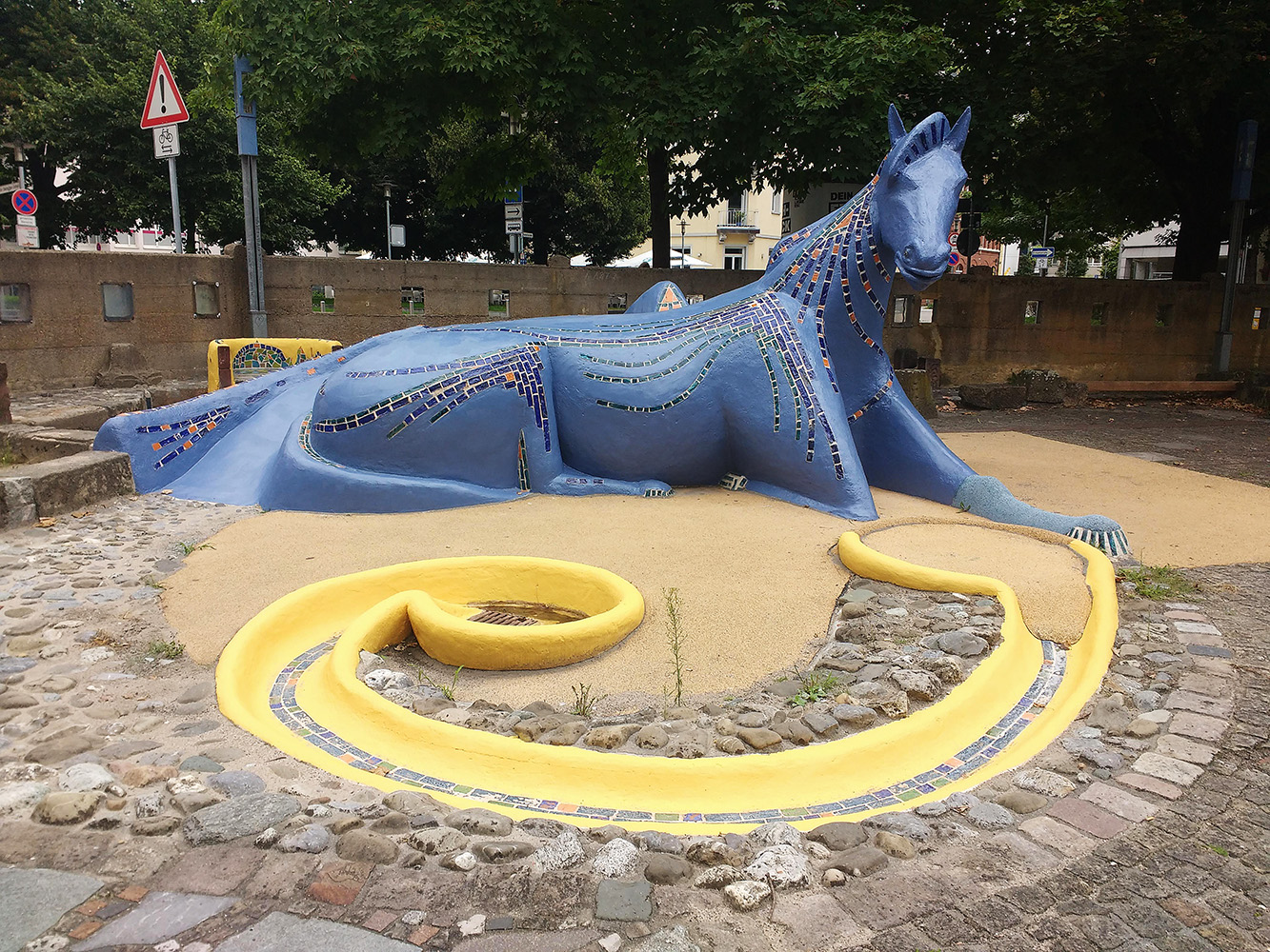 In Zusammenarbeit mit dem Grünflächenamt wurde ein Konzept erarbeitet um den Platz wieder zu beleben. Die Idee des blauen Pferdes war geboren, inspiriert von Franz Marc “der Blaue Reiter“. Spuren aus der Weststadt, alte Zahnräder, Klinkermauern. In die Einfassungsmauer um das Gelände wurden kleine Fenster ausgesägt. Für die Kinder besteht auch die Möglichkeit im Sommer mit Wasser zu spielen. Aus den Nüstern des Pferdes kommt Wassernebel, aus dem Pferdemaul ein Strahl bei Knopfdruck. Das Wasser mäandert in einer Spirale zurück. Die farbigen Mosaiken wurden in Handarbeit hergestellt.